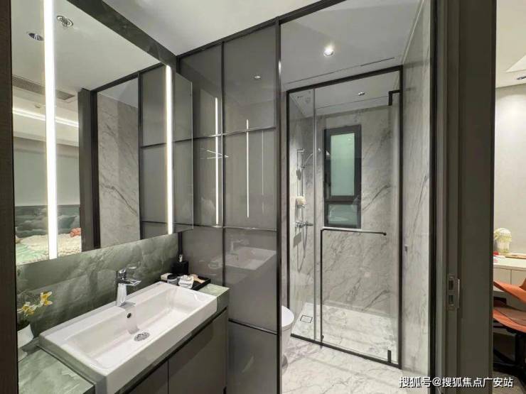 卫生间的洁具都是高仪零售款。主卫部分,目光所及之处几乎全是岩板,这个台面使用的浅绿色大理石也有个好听的名字“只此青绿”。