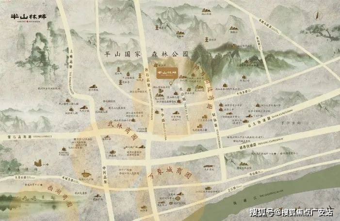 【项目四至】紧邻半山国家级森林公园 半山、龙山、虎山三大公园连通,组成一个大的半山森林公园,公园总面积约172公顷,总长23公里的游步道,森林覆盖率90.1%,空气负氧离子平均每立方厘米4000个,空气中细菌浓度也大大低于城区,森林公园多年平均气温16.5℃,年平均湿度80%左右,堪称杭州城区的森林氧吧