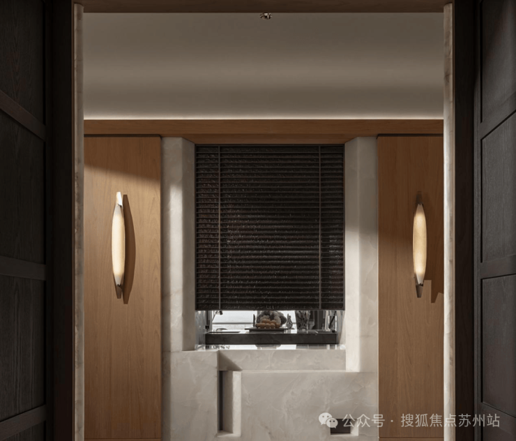 奢材的遴选,是对“权力美学”的深度呼应:玄关处白雪公主玉石,以通透莹润的肌理,像月光倾泻般铺就外滩私邸“入门即尊荣”的隐喻;祥云灰水墨岩延展地面的流动诗意,与外滩华尔道夫同源共生;而最为珍稀的,当属主卧背景墙上威尼斯安缦级树瘤木与巴黎宝格丽同源羊皮纸的邂逅——两种天然文明在此对话,营造出一种可被触摸、被感知的官邸奢感。