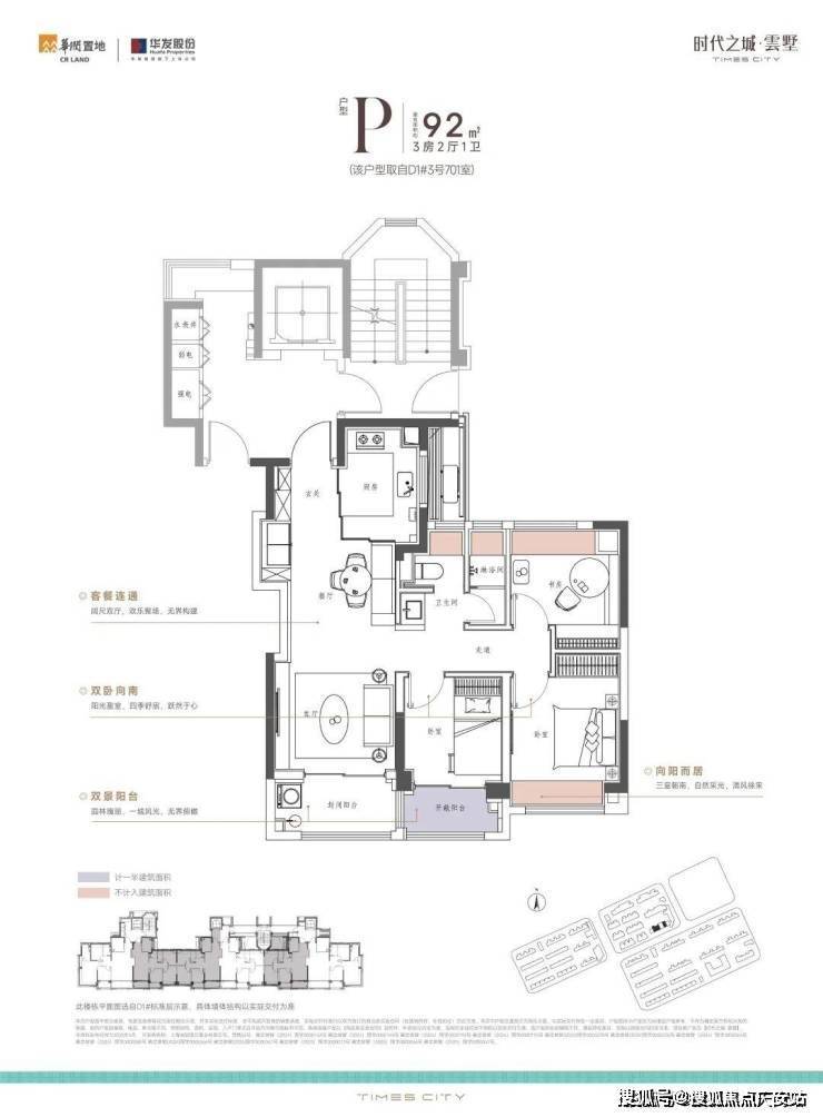 2、建面约92㎡的3房户型,高层产品同步共享南向双阳台,户型方正、南北通透、明厨明卫。S墙的设计利用空间错位放置冰箱,腾出了将近一个平米的厨房空间。