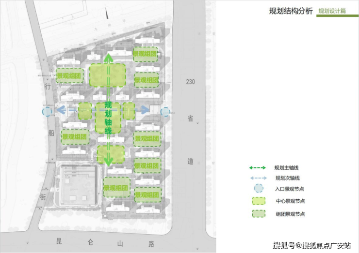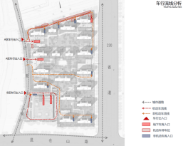 人车分流,机动车在靠近出入口的坡道进入地下车库,步行居民通过组团间的景观道路入户。