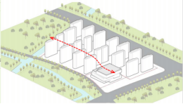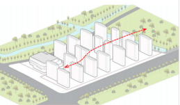 建筑体量整体采用“南低北高”的策略,东南角住宅局部降低,北侧高度均衡,与周边相协调。