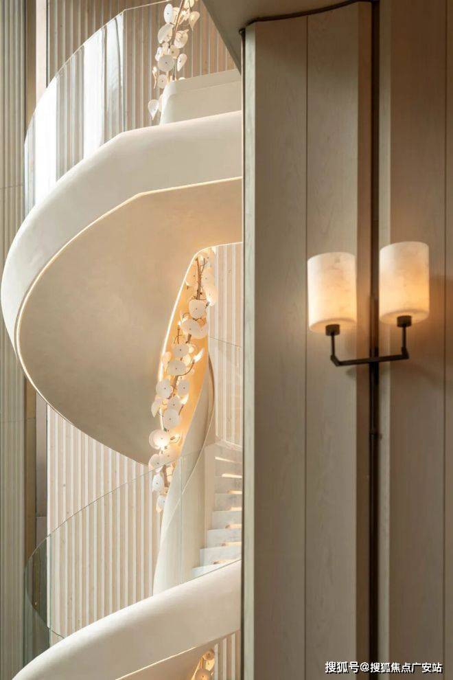 旋梯以流畅曲线漾开攀升的韵律,中心灯饰如藤蔓向上生长,与梯身相映成和。