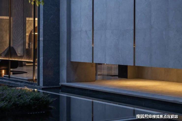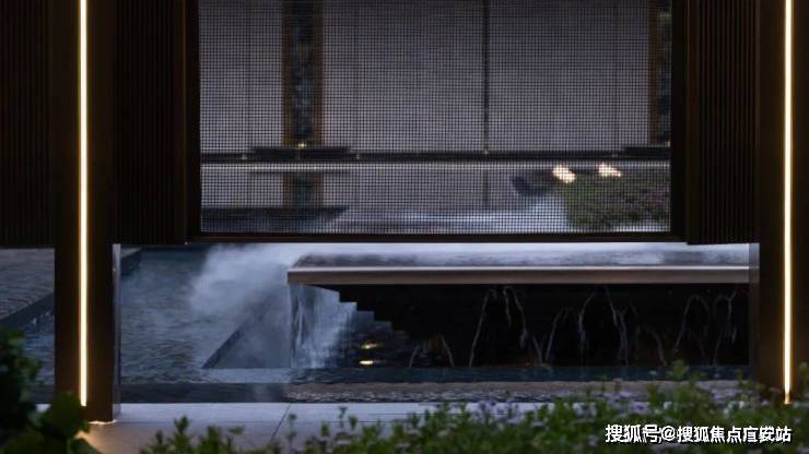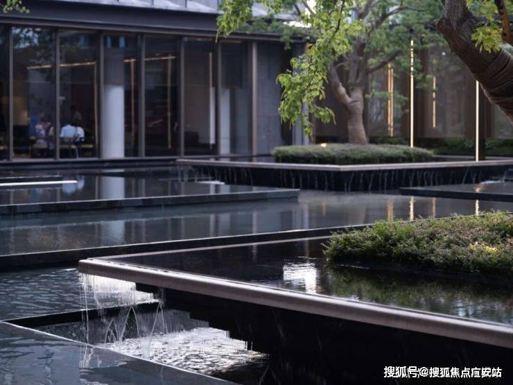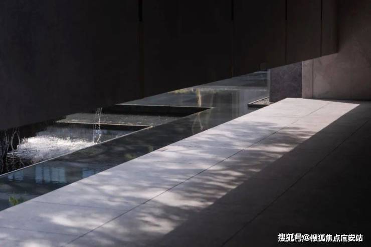 漂浮的绿屿水台穿插在层层跌水中,与建筑盒子产生流动的空间关系。