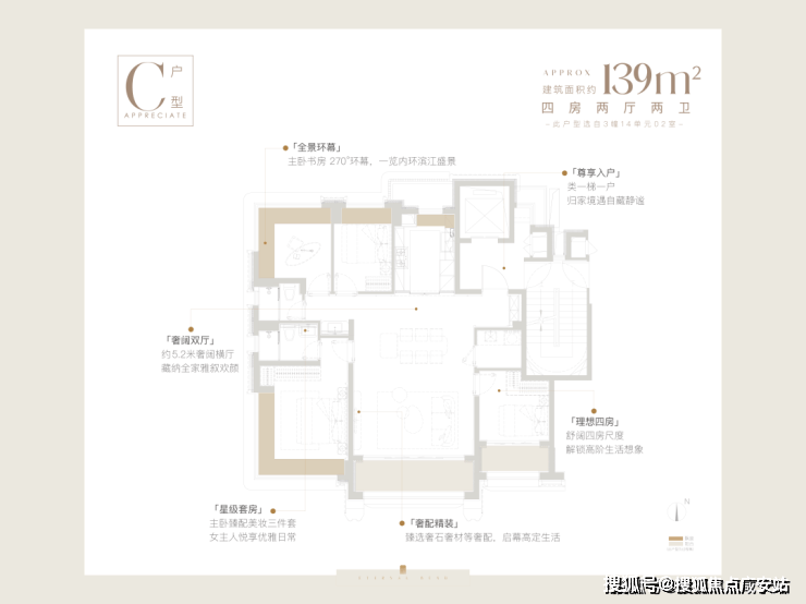 户型产品:主力户型为115-139㎡,包括一梯一户 115㎡三房、双 270°转角飘窗 130㎡四房及 LDKB 一体化横厅 139㎡户型,均为精装交付 。1