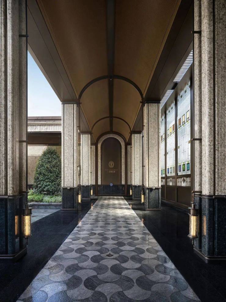 约30米的艺术连廊,借鉴PRADA荣宅多立克柱式以及和平饭店的拱形廊道,摩登海派,魅力十足: