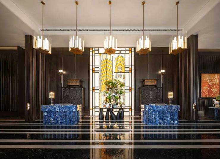 细节之处,光是一个接待台,就采用了产自玻利维亚约4500米海拔的高原矿脉——玻利维亚蓝石材,是世界上储存量最少的石材之一,非常珍贵;而大堂的柱子,也是巴西乌金奢石;