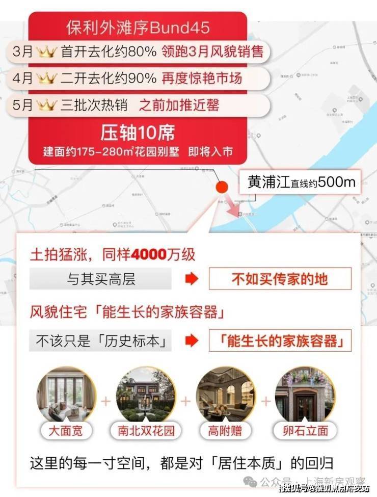 杨浦滨江风貌带全新供应,约500米滨江+臻稀风貌+超级花园,保利·外滩序BUND45在首开去化约80%,领跑3月全上海风貌销售榜后,保利·外滩序Bund45风貌于4月再度入市,去化约90%。