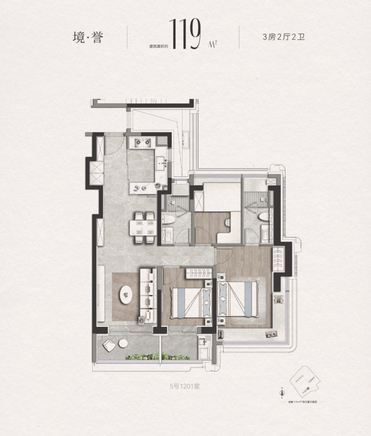边套A户型是三面采光户型,客厅连接阳台,视野出众。