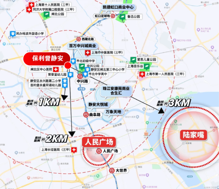 医疗资源方面,项目周边约3km范围内上海市中医医院(三甲)、上海长征医院(三甲)、上海市第一人民医院(三甲)、闸北区中心医院、上海第十人民医院(三甲)、同济大学附属口腔医院(三甲)环伺。