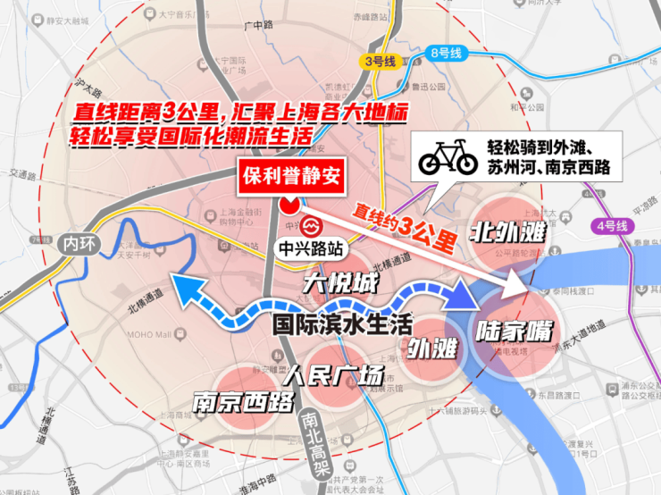 而项目到外滩和平饭店的直线距离正好是约3公里!妥妥的城心烫金地段!
