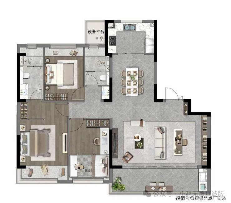 与大横厅相同开间的阳台,进深约1.8米,在满足生活所需的同时,可以达到观景的效果,甚至可以放置一些健身器材,作为家庭健身空间。