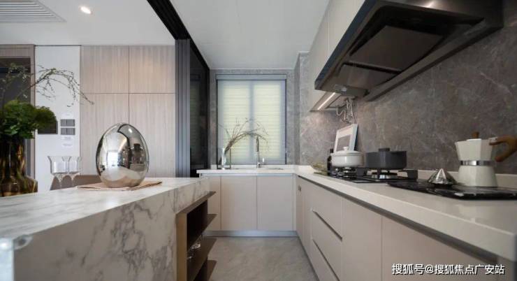 墙面也采用的是冠珠800*800大尺寸瓷砖铺装;甚至在容易被忽略的厨房吊顶,金地峯范也采用了300*600规格的集成吊顶,较少拼接面,更加大气。