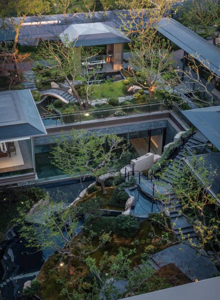 庭院的选材也极具讲究:太行山金景石堆叠成小山丘,岭南古桩铁冬青与中华原生乌桕树移栽而来,蕴含“聚财守业”的美好寓意。细节之处,经得起推敲,让人越看越有味道。