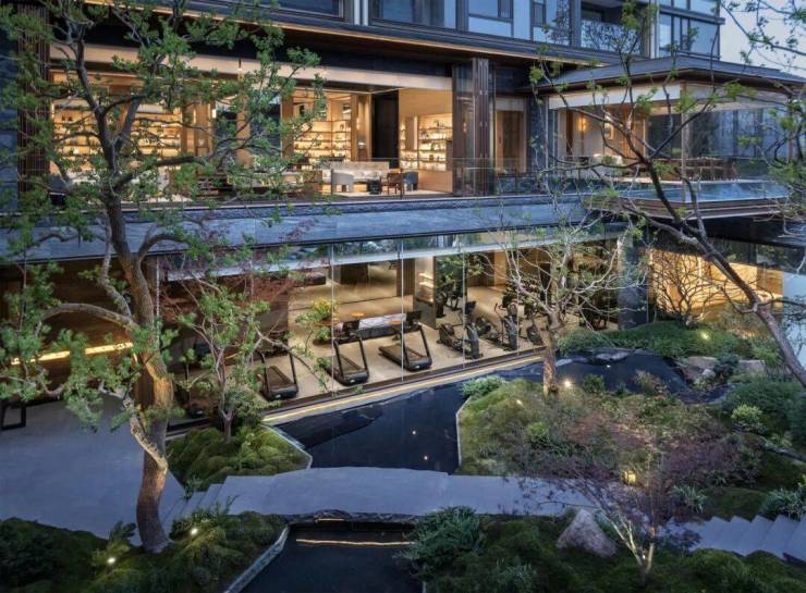 健身房配备的是全球顶尖的奢华品牌——美国必确(Precor)的专业器械。这里直面下沉式庭院的景观,绿意扑面而来,让运动不再只是汗水的释放,而是一场身心的舒展。