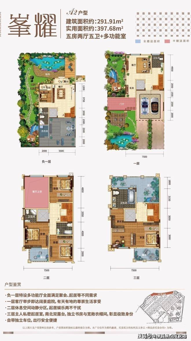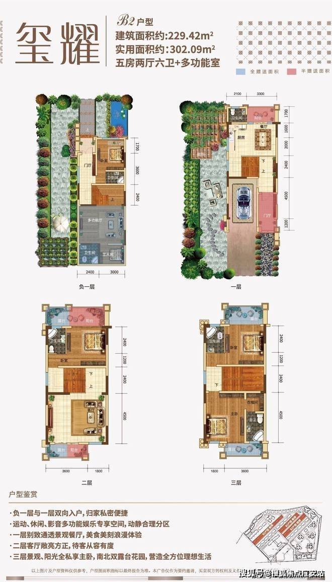 目前市面上少有的双拼产品,除了前后花园外,带有电梯入户,同样是地下1层地上3层的结构,户型面积290㎡,地下室赠送约45㎡,露台阳台赠送约61平米,前后花园赠送面积约220㎡。
