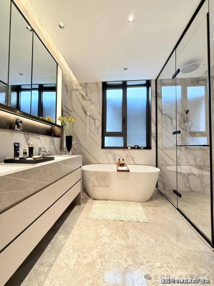 这个是入户玄关处的地面,大理石地面搭配金属线条勾勒出玄关地界,归家的氛围感从这个区域就开始了~这还不是重点,玄关座椅背后,是一面皮革包裹的墙面。鞋柜下方做了悬浮处理,同样也是内嵌灯带,这里灯光的角度还会再调整,因为灯光映射在大理石地面上,要显得尽量柔和不刺眼;同时,鞋柜下方可放拖鞋,还能放扫地机器人,便于日常清扫打理。鞋柜的饰面,纹路方向统一,呈现出极强的协调感。橱柜作为强功能性的收纳系统,自然少不了操作性能上的考究,吊柜做了升降式的拉篮,以后再也不用爬上高凳拿取了。下方的橱柜则做了转角拉篮,充分利用转角空间,使物品井然有序的同时,轻松方便取放。水槽也是一个大单槽,放得下炒锅汤锅这种大物件~抽拉式龙头,清洗大水槽的时候很方便,360度旋转伸展自如,这款弯管还是硅胶材质,柔软耐用有弹性,还可切换出水模式,出来的水柱也是很柔和细腻不飞溅。厨房玻璃门是上轨道移门,意味着地面部分没有任何轨道,不会有灰尘积攒,炒菜时关上,避免油烟散入室内;平时拉开,可以扩充室内视觉感受。卫浴缦云上海所有户型的所有卫生间里都用了悬浮式的洁具和柜体,确保了下方空间的打扫无死角,对未来的入住带来非常大的便利性!吉博力同层排水技术,静音是最大亮点;特制“水母”地漏,多重防臭防反溢。干净舒适的卫生间,是从空气到水流的全面把控~你们可以看下缦云上海是如何处理卫生间木门的防潮的——卫生间一侧用大理石做踢脚线,这是真正细致入微的巧思!主卧卫生间配备的电热毛巾架简直就是遇到潮冷节气的“福音”,让毛巾、内衣都能够提前加热干燥。层高对于缦云上海的纯大宅社区定位,能买这样产品的购房者会非常在意空间感。缦云上海全部户型层高约3.3米,室内所有空间的门都做了通顶设计,更阔绰的居室空间,将生活格局有效放大,通风、采光和观景体验的全方位提升!弧形元素缦云上海样板间里随处可见柔和的圆弧修饰,特别是柜体、墙体包边的圆弧转角,在进出各个空间时,减少磕碰的风险,对于有孩子和老人的家庭来说,是非常实用的友好设计。而且,门套做了弧形设计后,还叠加了金属线与墙纸做了分割,加强隔断界限感,提升室内家居精致度~比起中规中矩的直线,弧形施工工艺更复杂、造价更高,却多了几分灵动轻盈!这种弧形的元素不只是在样板间里,在售楼处也能经常看到,比如电梯厅。