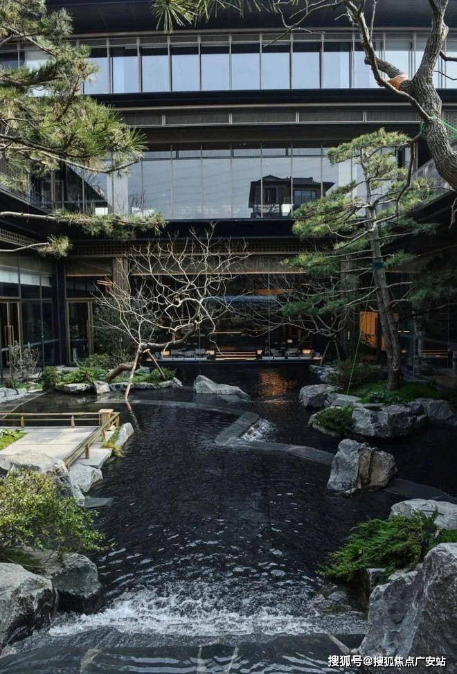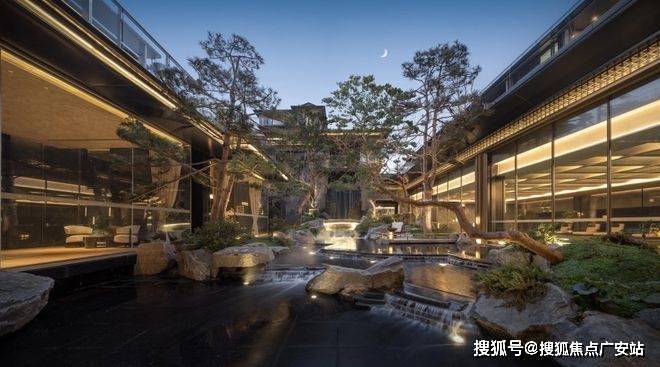 漫步于光影交织的幽静庭院,您将踏入一方充满诗意的天地。潺潺流水映照着婆娑树影,挺拔树姿为这片空间注入向上的生机,纵向延伸出无限的视觉张力。这座下沉庭院,不仅拉近了建筑与自然的情感共鸣,更使室内与景观紧密相连、和谐相融。每一扇窗户,都犹如框中的一幅生动山水画。