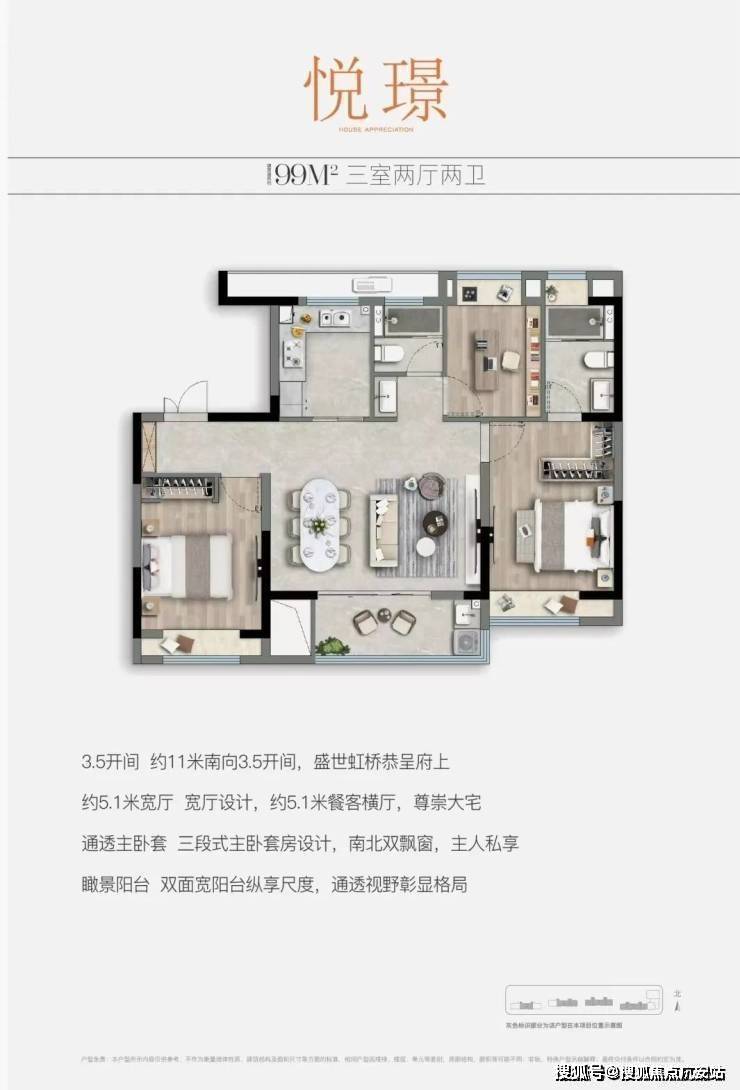 户型点评: 百平左右的户型打造三室很常见,但能同时做到南向3.5开间属实难得;餐客横厅更是达到了约5.1米的宽度设计,大幅提升了生活舒适度、以及实用性;主卧套房,涵盖步入式衣帽间与独立卫浴,南向自带飘窗,缔造尊贵私密私享。