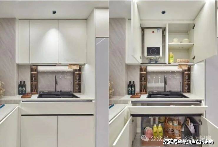 譬如说部分柜体更安全的圆角处理、高柜顶部一窥到底的镜面反光膜、大大提高空间利用的薄抽,不用弯腰一踢即开的踢脚抽设计,便利性大大增加;