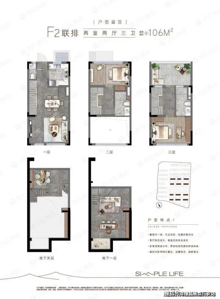 户型:在售建面约 106-109㎡联排别墅,一层客餐厅一体化设计,客厅开间约 4.7 米,二层北向设有次卧,三层为南向大套间主卧,部分户型带有地下室。