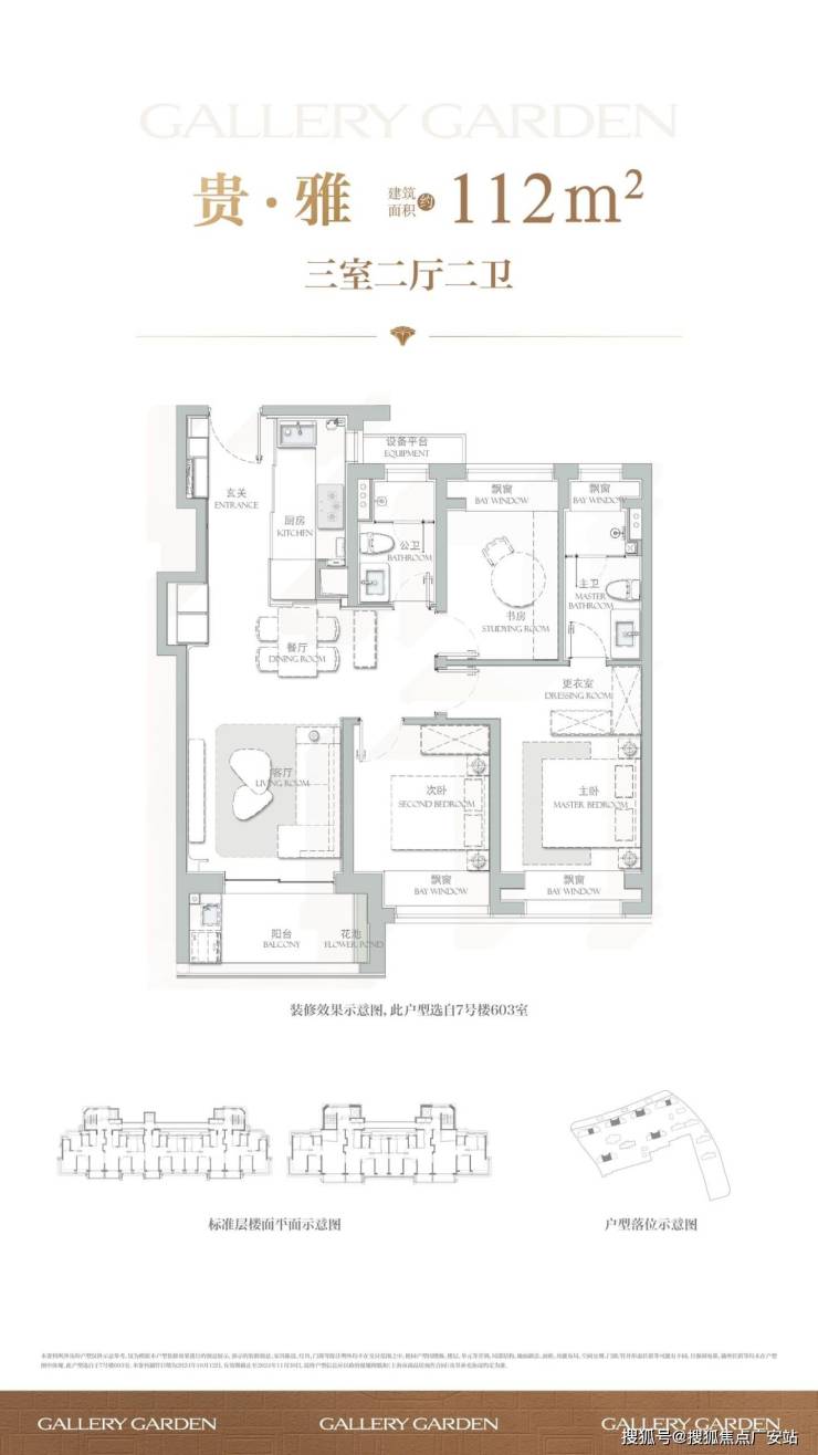 112㎡三房:三开间朝南,S墙设计扩大厨房空间,转角阳台实现270°观景,高区可远眺徐汇滨江。
