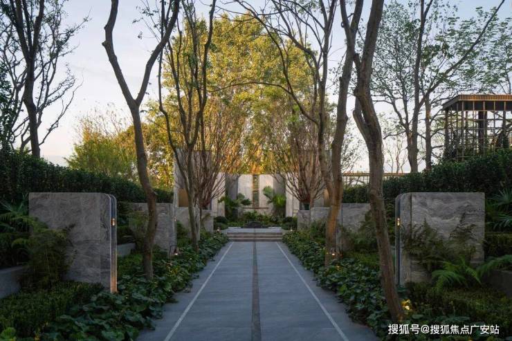 约100米长的私家礼道,两侧4米高景墙庄严夹道,整整齐齐的香樟树撑起"绿色的华盖"