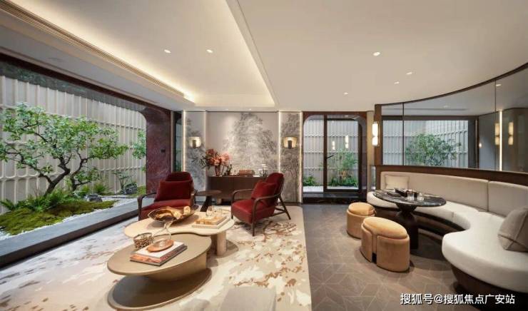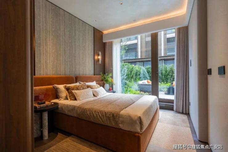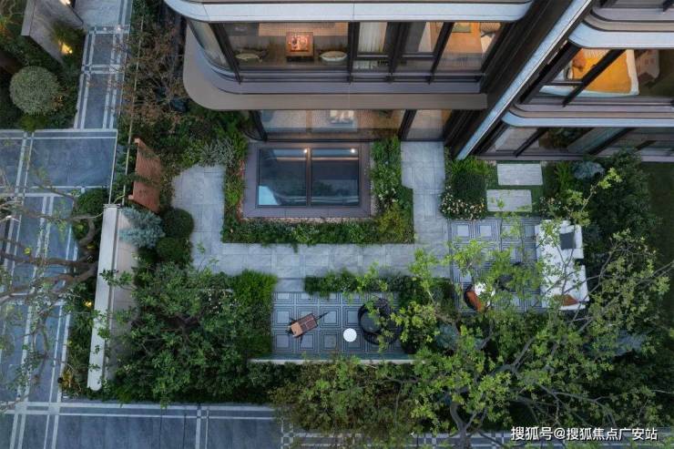 庭院中央采用巴西进口亚马逊绿奢石打造的流水景台,单价高达约4000元/㎡,配合灵感源自复兴公园紫藤廊架的景墙,潺潺水声与静谧光影,共同凝筑成一个静谧诗意的角落(项目红线外不作为交付承诺)