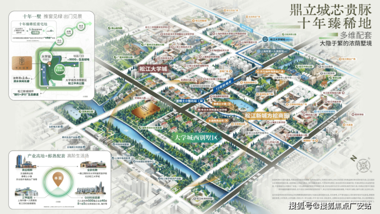 萃屿原墅所在的松江新城高端别墅区北接松江大学城,南临G60科创走廊,东靠政务金融中心,西邻油墩河谷规划,兼具成熟配套与产业动能: