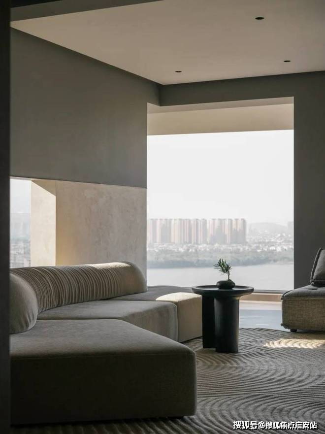 客厅是家里绝好的观景位之一,设计师在简约淡雅的沙发背景墙上开了一扇小窗,用“框”和“块”的手法,江景在有序的空间节奏中次第展开,成为家中的独特符号。