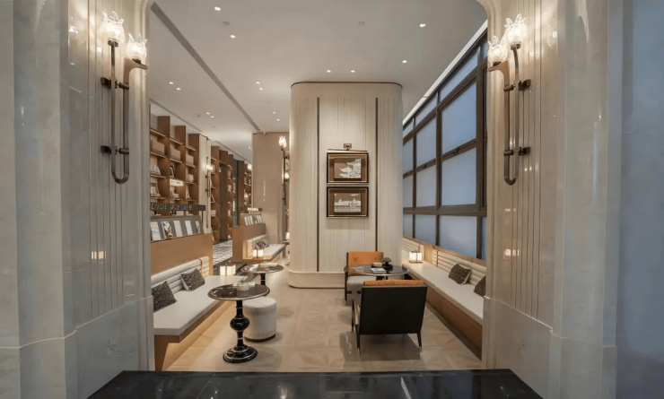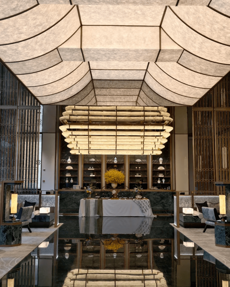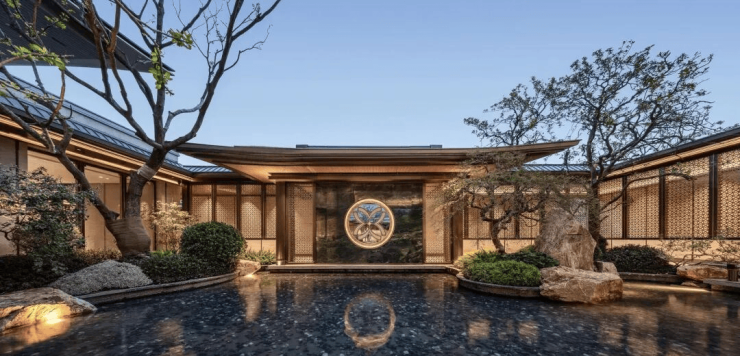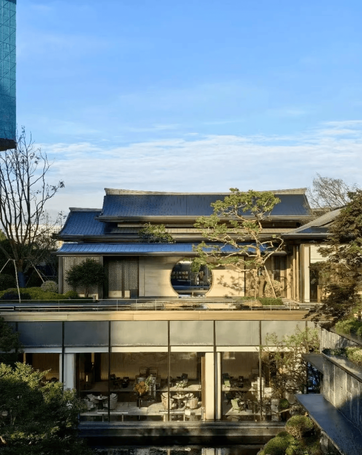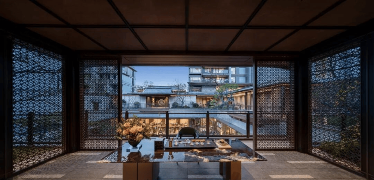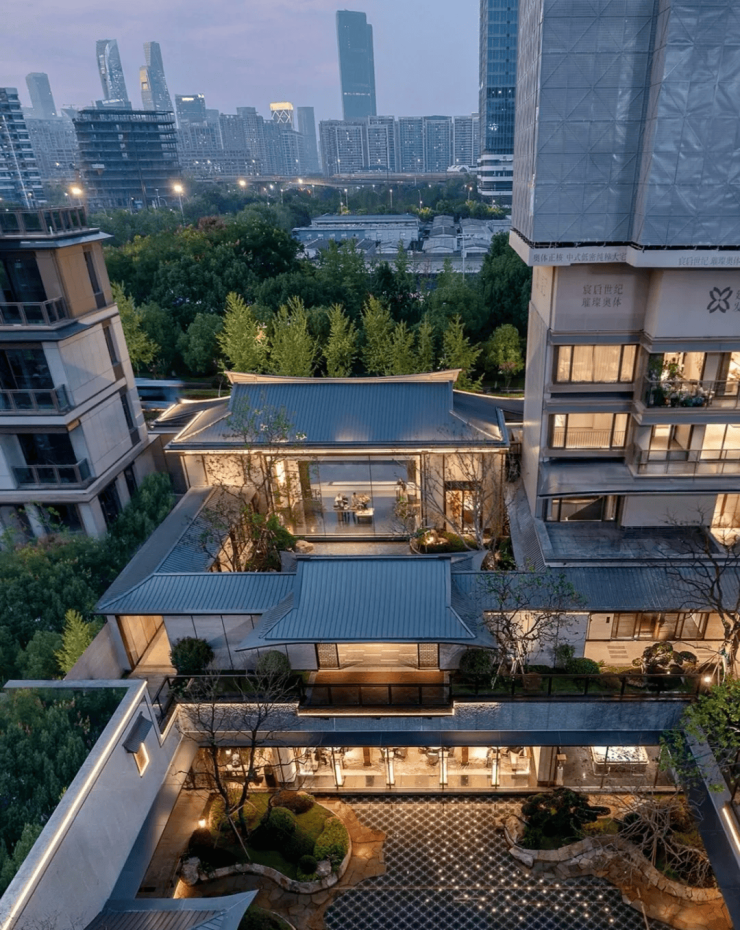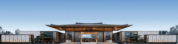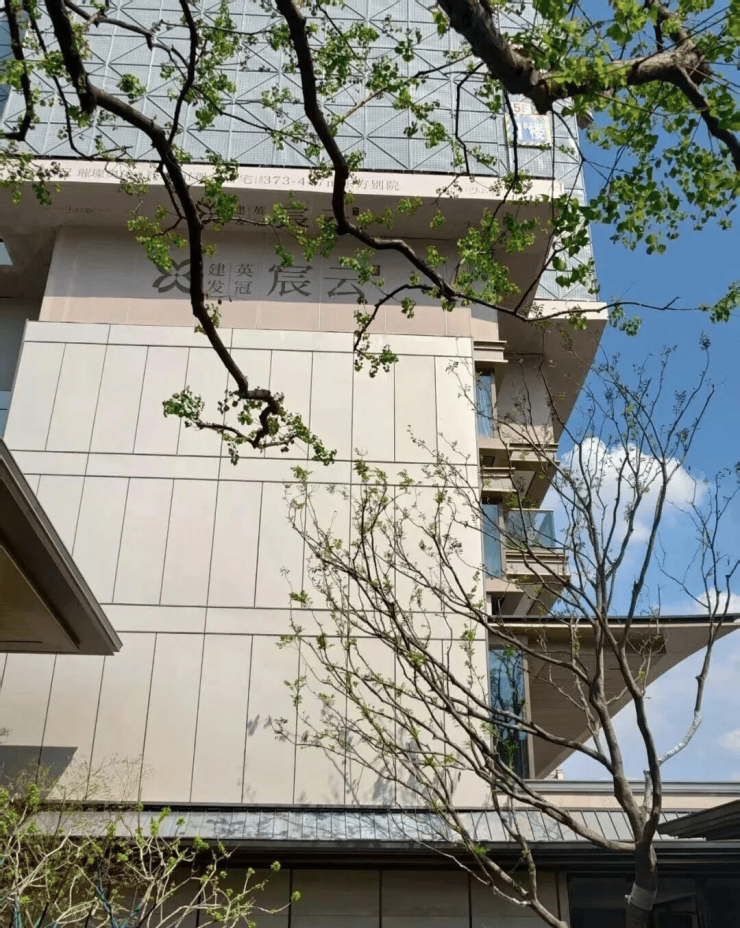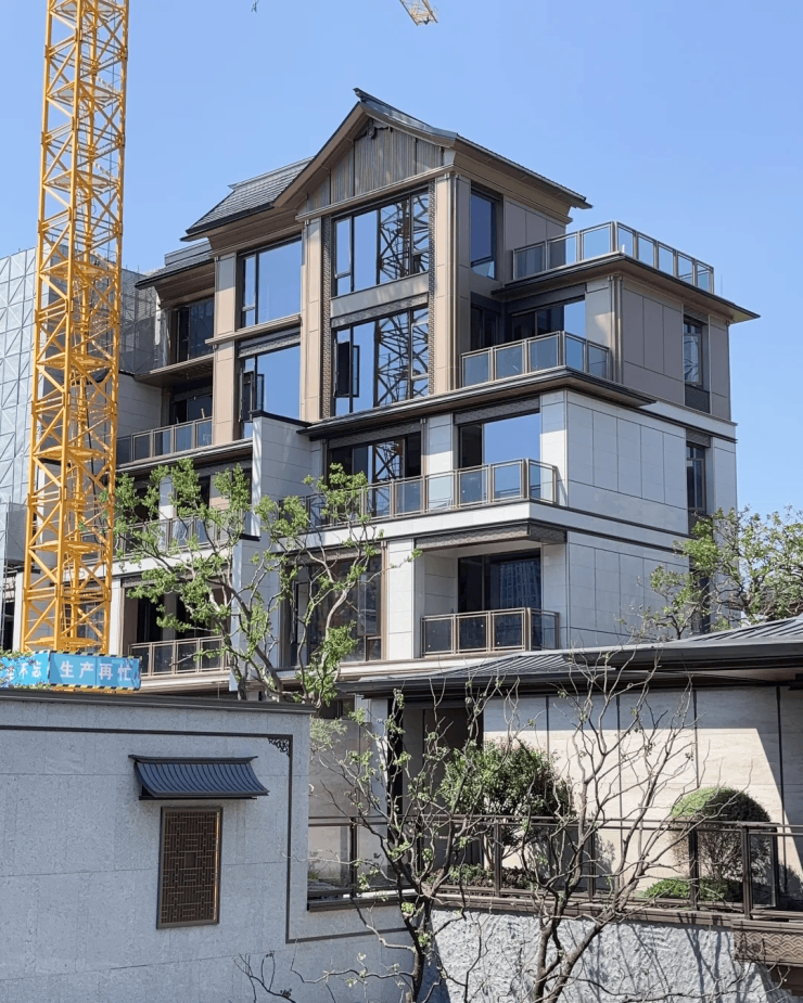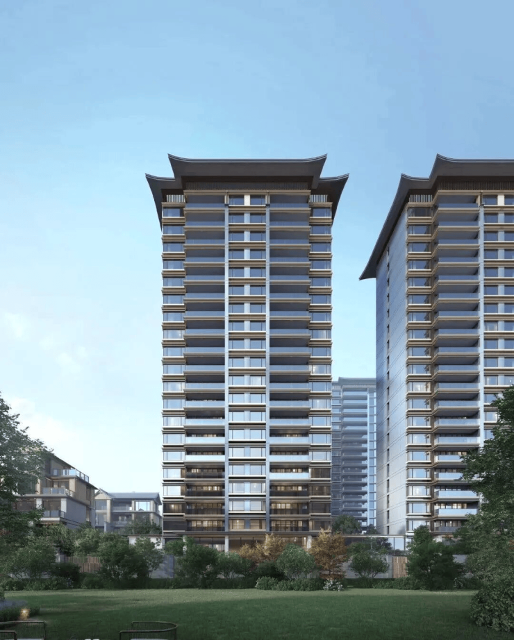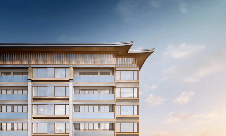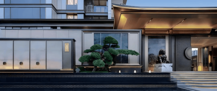 大平层建筑立面以大面积铝板、首层局部石材及大面积玻璃构成,屋顶建发中式标志性的飞檐设计,美观的同时还比较显格调。