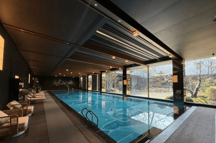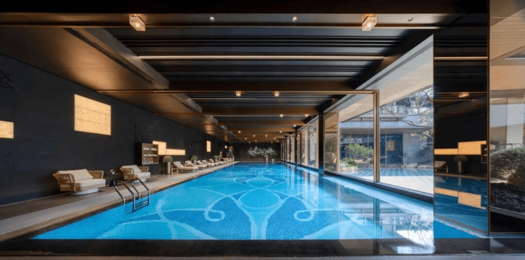 建筑面积约1800平方米的下沉式会所(含下沉庭院),户均会所空间达到约10.9m,内设恒温泳池、私宴厅等功能空间,所有区域环绕下沉庭院布局,风景还是非常不错,例如高定私宴厅,对望下沉式庭院景观,享受美酒佳看之余,还能欣赏如诗如画风景。还有500㎡架空层泛会所配备健身房、咖啡吧、书吧及童玩区,功能齐全。