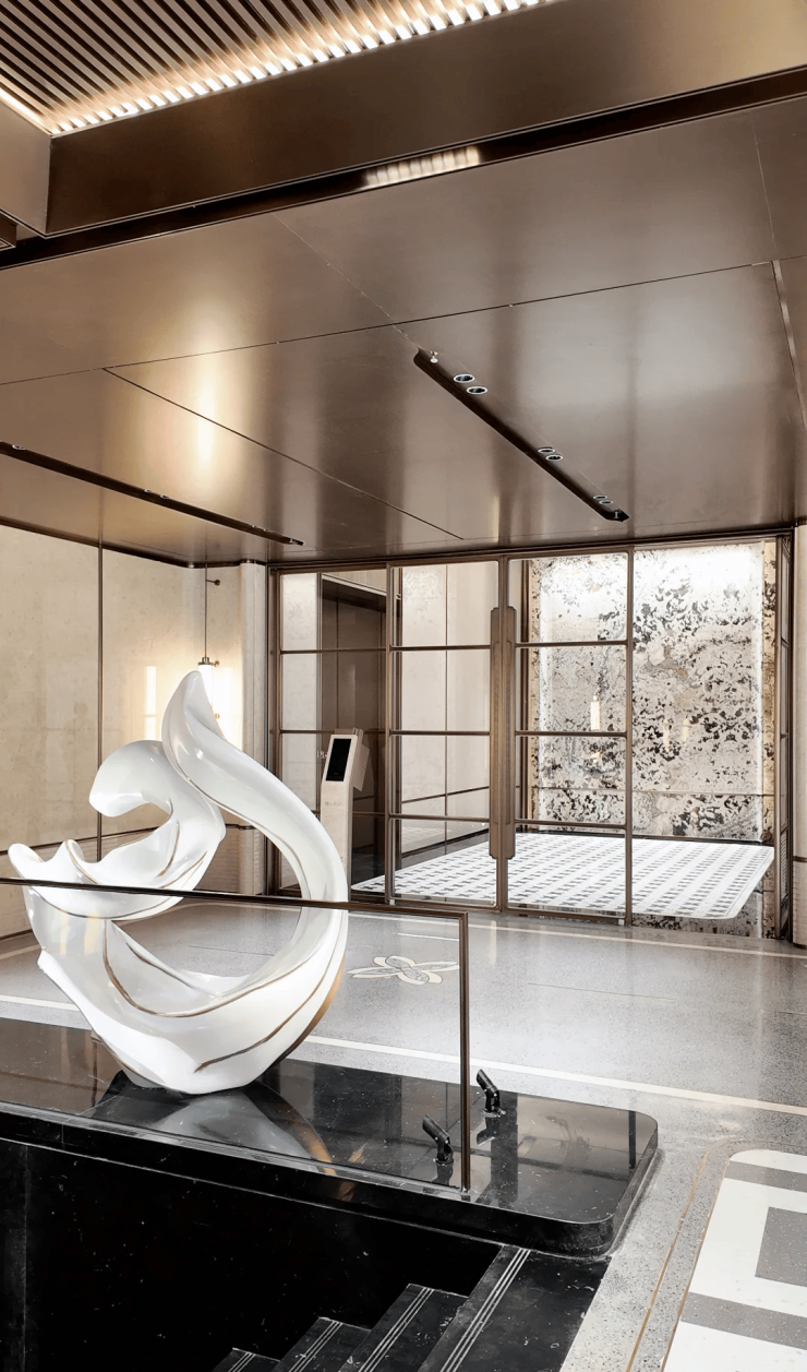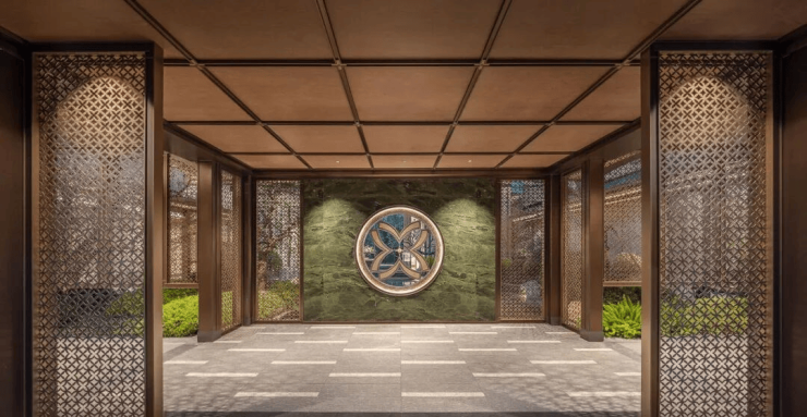 小区大门为歇山顶大门,形制媲美故宫乾清门,宽约53米(含景墙)、高近11米,鸱尾微翘,门两侧各置一块价值百万的蓝翡翠奢石,匹配高约2米(含基座)、重约600斤铜狮镇宅,搭配罗汉松迎客造型树,高定气场扑面而来,再设七级台阶,寓意步步高升,仪式感十足,中式的尊贵感从归家开始就把情绪拉满。