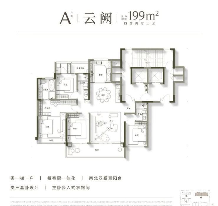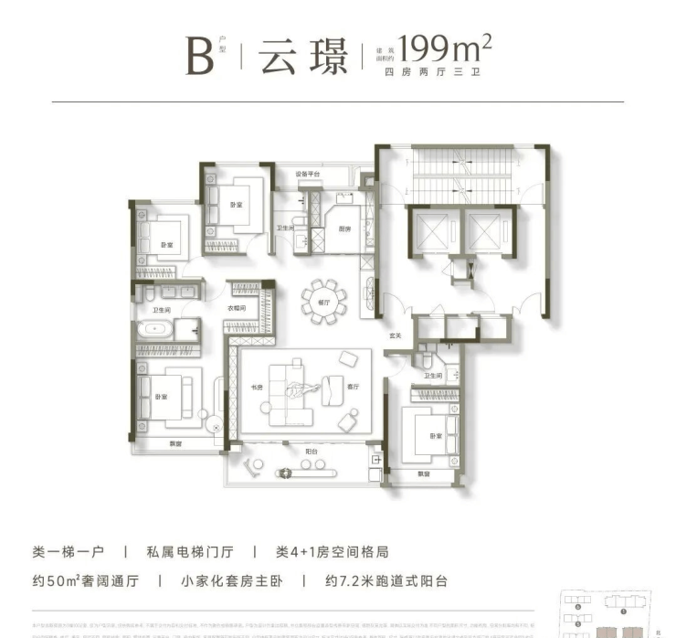 高层建筑面积约199平方米,提供A、B两款四房两厅三卫双套房设计,南北通透,类独门独户,配备南向奢阔瞰景阳台,每一款都极具吸引力。西面排屋建筑面积约371-452平方米,仅12席,实际得房率超240%。
