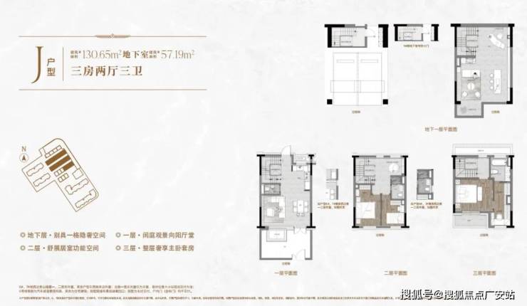 一楼和地下室主社交和志趣,二楼是子女的房间,三楼是主人休憩区。