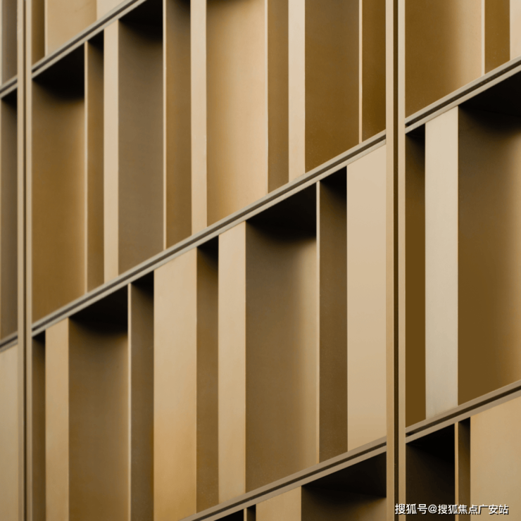 50米长、6米高的宏大景墙如同一幅精致都市幕帘,磅礴气势矗立于此,建立视觉初印象。立面采用沉香米黄莱姆石,价格7-10倍于普通石材,搭配激光刻纹鎏金奢板,轻盈精致,瞬间回溯到19世纪的上海滩剧院,穿门入境,有如充满历史感的幕帘拉开,演出即将开场。