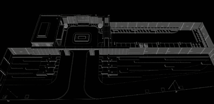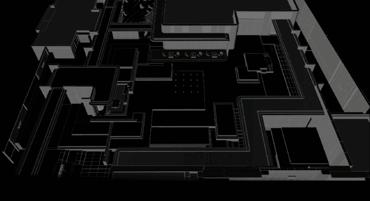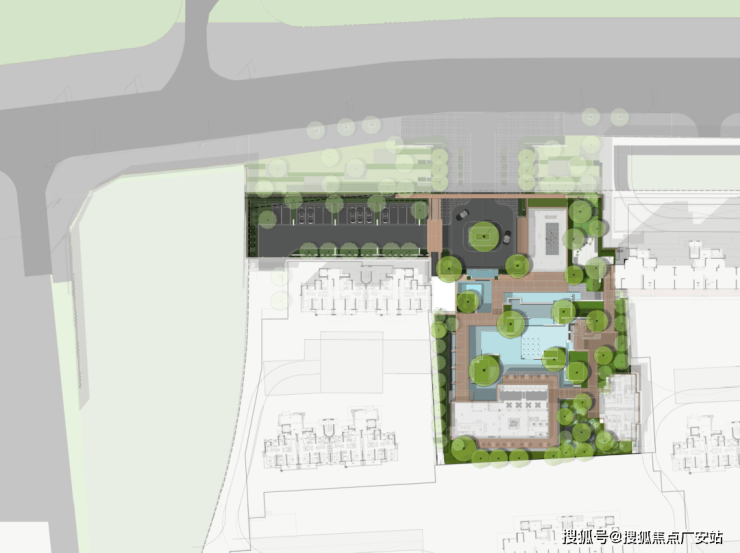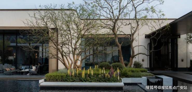 后场空间以景观思维整体打造,设计围绕水院部署功能,连廊围绕水院,拉长游园体验;售楼处视为游园中的一处休闲小屋,与水院互通,模糊室内外边界,让洽谈随时可以浸润到水院氛围之中。