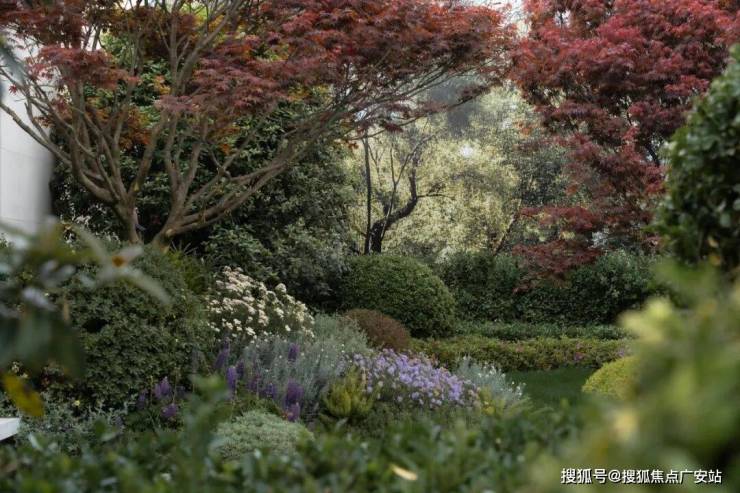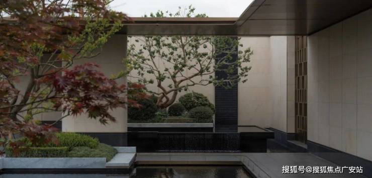 咫尺楼台水瀑氤氲,搭配精选红枫、红果冬青、乌桕,层层变换,错落有致,绿意盎然。