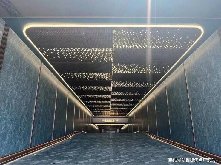 星空连廊的顶面采用香槟金铝板、墙面为爱马仕灰仿石砖,并镶嵌金属线条、就连地面都采用了夜里雪仿石砖。