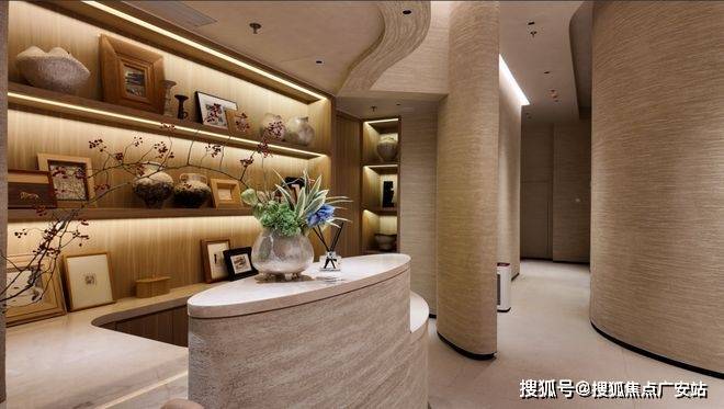 本次开放的6号楼实景大堂,一层单元入户大堂约7米挑高空间,自带归家仪式感。整体风格简约、艺术,圆弧形纹理的吊顶再次呼应整体曲线设计语言,搭配暖色灯光和大面积落地窗,既保证了整个空间的通透敞亮,视野无阻,又巧妙地柔化了氛围,让硬朗的建筑多了份优雅与温馨。
