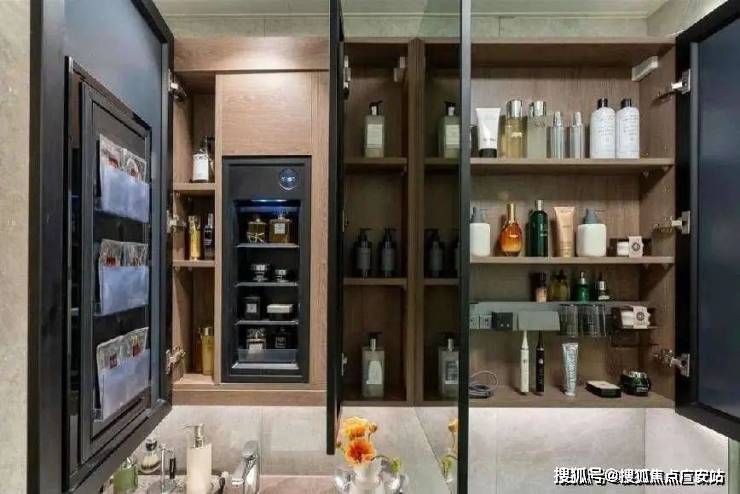 主次卫皆选用了松下的智能马桶。主卫的镜柜内还设计了美妆冰箱和集成柜,不仅可以更好地贮藏名贵化妆品,而且也是更合理的化妆动线设计。