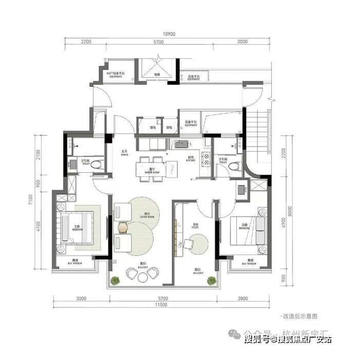 这款户型做到了四开间朝南,面宽约11.5米,“小面积大面宽”的空间格局可以媲美120