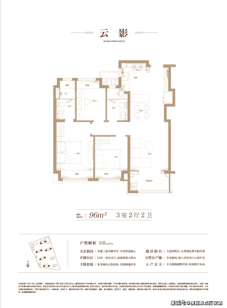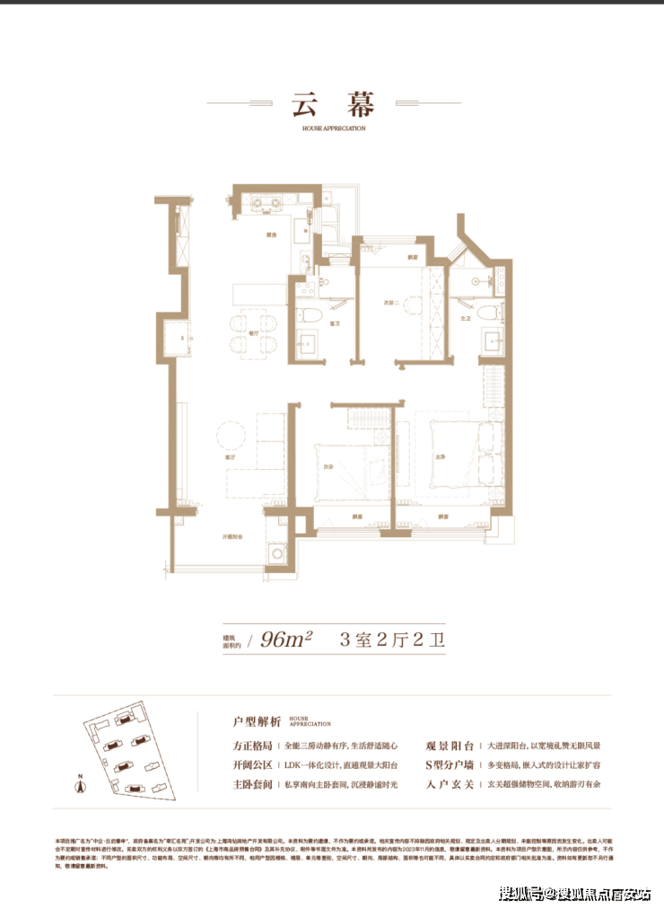 01.户型图赏鉴建面约96㎡,充分从居住者的角度考量生活动线、舒适度与生活感。S型的分户墙,褪去呆板,为家具预留更多的空间;LDK一体化的设计打破空间局限,解锁更多的生活场景,也拉近家人间的距离;主卧套间自在独处,生活的优雅时刻尽显……
