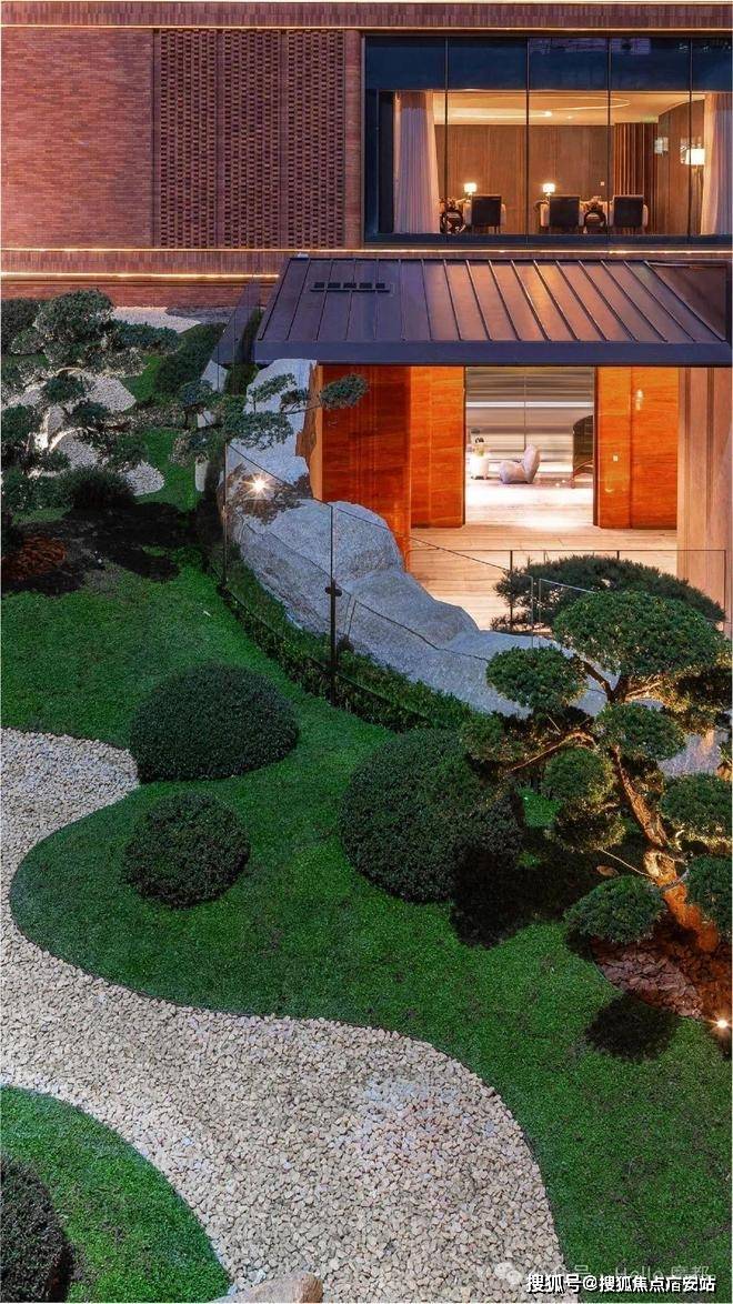 山水庭院汲取《足立美术馆》的造境手法,以老石皮、百年古木原样搬运,重现山间岁月的自然痕迹,与庭院中的光影交织,仿佛将山间的自然采光与静谧之感搬入城市。阳光透过树梢洒落,石皮上的纹理在光影中若隐若现,宛如一幅流动的自然山水画卷。