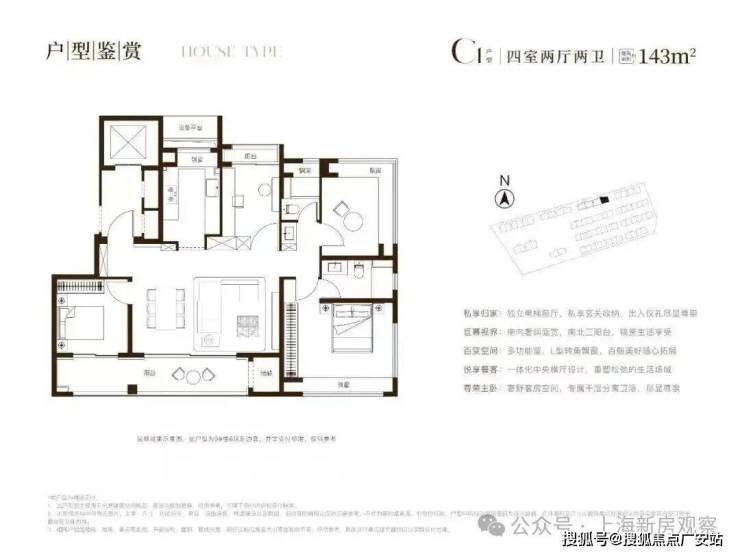 143㎡ 四房两厅两卫:950-1200 万|四开间朝南,6.4 米大横厅,主卧套房,私梯入户