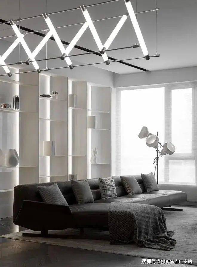 客厅的设计独具匠心,采用了无主灯设计,巧妙地梳理了空间的层次感。灰色的布艺沙发与整体空间风格相得益彰,售楼处电话/地址☎:400-877-8334(预约热线)✔✔✔舒适而优雅。沙发背后的整面收纳墙不仅凸显出极高的生活品味,还为空间增添了实用性。落地窗确保了充足的光源,让整个客厅充满了明亮与温暖的气息。