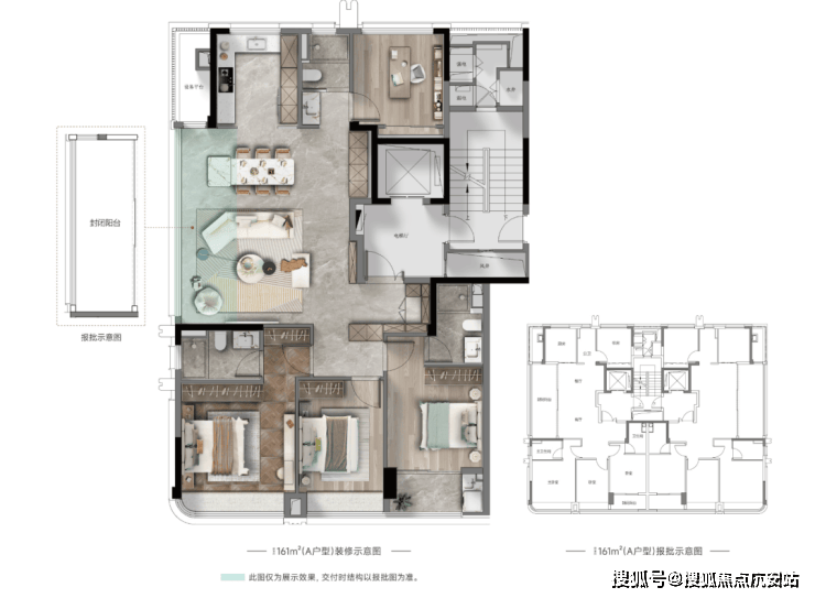 起步户型建面约161㎡,四房两厅三卫,两梯两户设计,私密性极好。