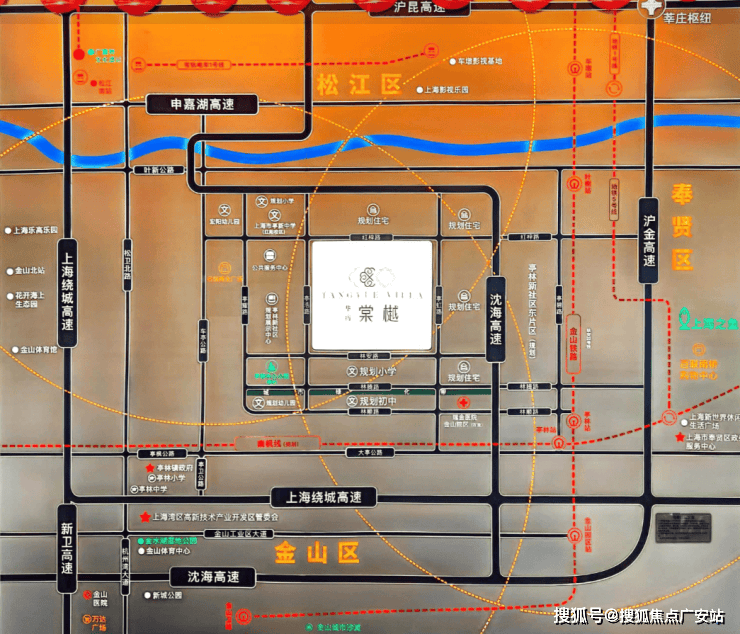 交通区位:临近地铁,地处金山、奉贤、松江三区交界,属虹桥国际开放枢纽南向拓展带核心节点