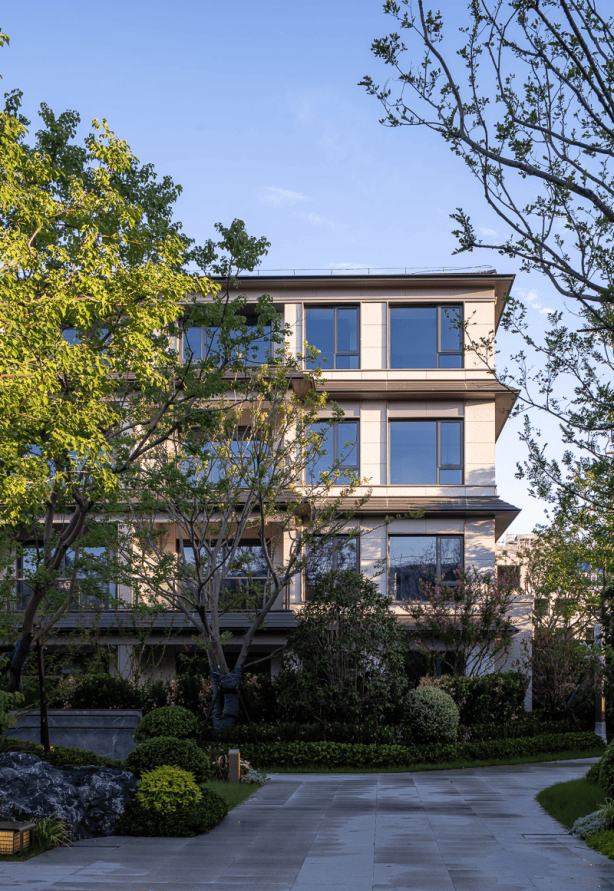 外立面采用银点白麻仿石一体板外墙,联排首层外墙为银点白麻石材,框架线条局部银白色铝板,细部装饰线条为香槟金金属线条,门头局部银点白麻石材及银白、香槟金铝板打造,整体形成典雅尊贵的现代中式建筑意象。