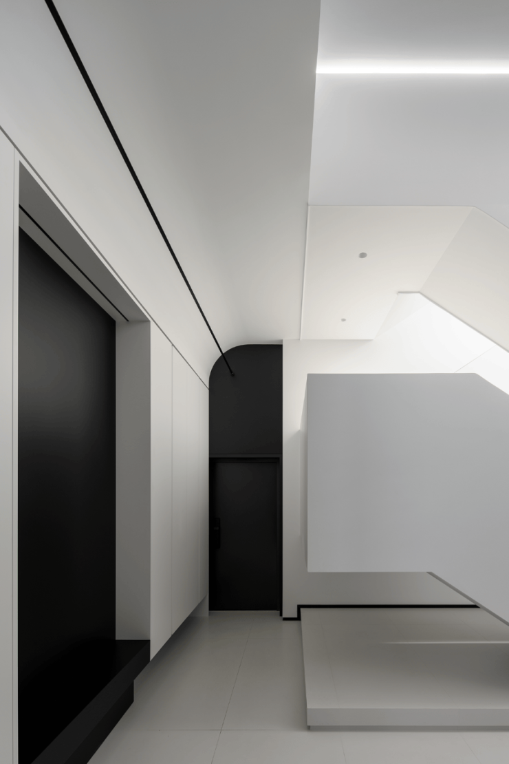 楼梯区完全被几何占据,自然光恰到好处的平衡,进一步呼应着空间的心境,衔接了生活和居所。